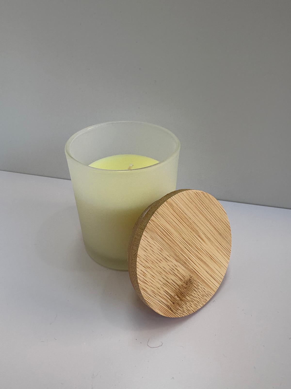 Vela aromática con tapa de bambú personalizada.